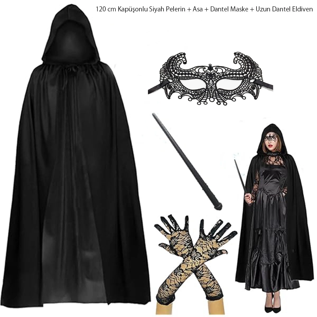 120 cm uzunluğundaki kapüşonlu siyah pelerin seti ile büyüleyici bir görünüme kavuşun Set içerisinde siyah pelerin, dantel maske, uzun dantel eldiven ve sihirbaz asası yer alır. Kostüm partileri, cosplay ve özel etkinliklerde şıklık ve gizem katmak için idealdir. Hem kadınlar hem de gençler için uygun boyuttadır.