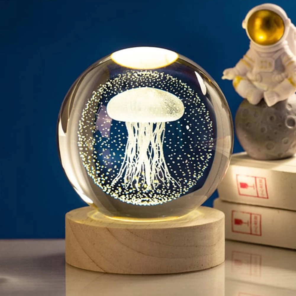 Gece Lambası, Ahşap Altlıklı Deniz Anası Cam Küre, Usb'li Dekoratif Led, Gezegen Küreler Ürün Ölçüsü:
